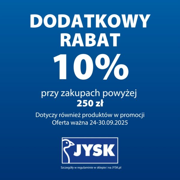 Dodatkowy rabat 10% przy zakupach powyżej 250 złotych w JYSK! Oferta dotyczy również produktów w promocji i jest ważna w dniach 24-30.09.2025 (tylko w sklepach stacjonarnych)